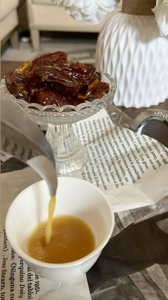 You will immediately find Gahwa (Saudi coffee) paired with sweets on the table.