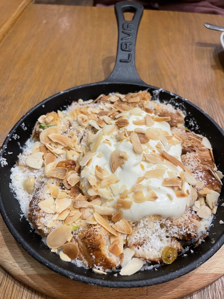 It’s usually made with pieces of puff pastry or croissant soaked in hot milk, sugar, and cream, then topped with nuts, raisins, and sometimes coconut flakes.